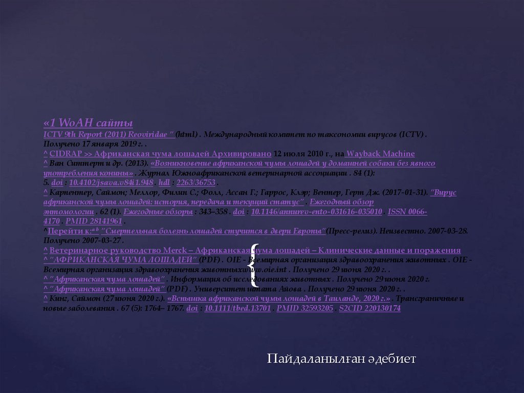 ^ "АФРИКАНСКАЯ ЧУМА ЛОШАДЕЙ" (PDF) . OIE - Всемирная организация здравоохранения животных . OIE Всемирная организация здравоохранения животныхwww.oie.int . Получено 29 июня 2020 г. .