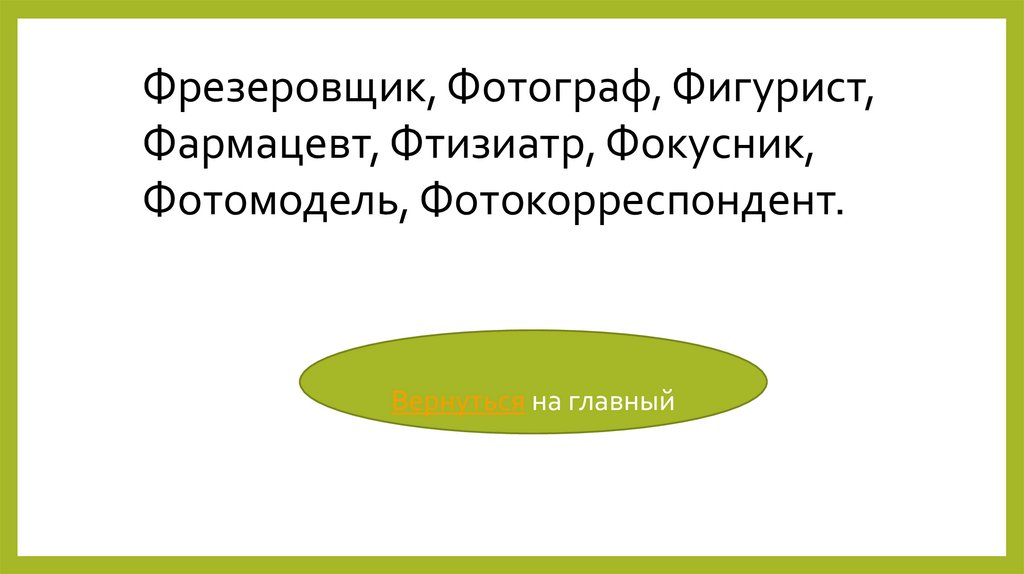 Фрезеровщик, Фотограф, Фигурист,Фармацевт, Фтизиатр, Фокусник,