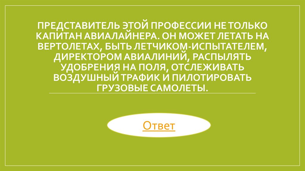 ПРЕДСТАВИТЕЛЬ ЭТОЙ ПРОФЕССИИ НЕ ТОЛЬКОКАПИТАН АВИАЛАЙНЕРА. ОН МОЖЕТ ЛЕТАТЬ НА