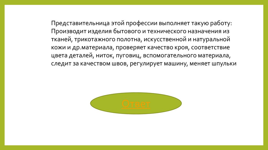 Представительница этой профессии выполняет такую работу:Производит изделия бытового и технического назначения из