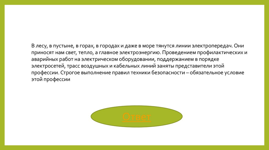 В лесу, в пустыне, в горах, в городах и даже в море тянутся линии электропередач. Ониприносят нам свет, тепло, а главное электроэнергию. Проведением профилактических и