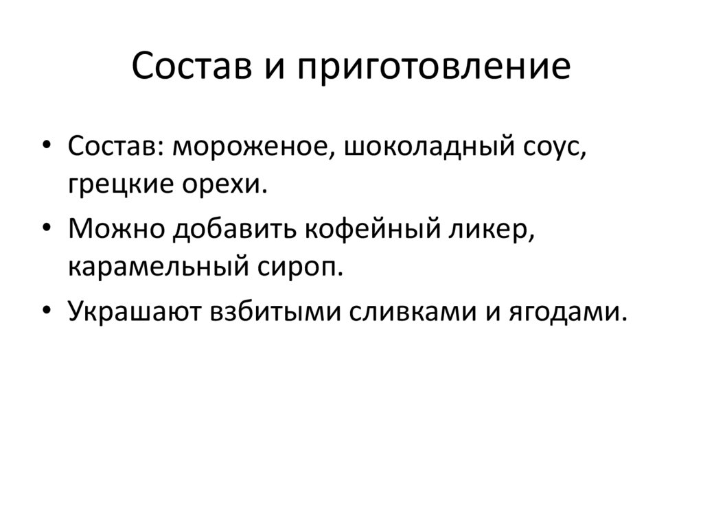 Состав и приготовление• Состав: мороженое, шоколадный соус,