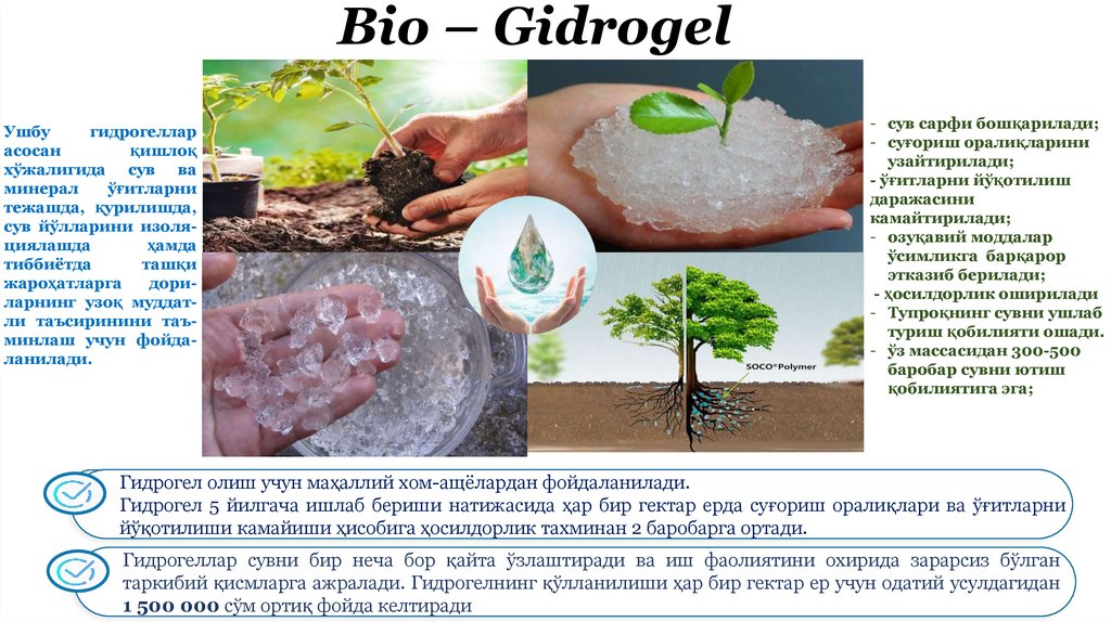 таркибий қисмларга ажралади. Гидрогелнинг қўлланилиши ҳар бир гектар ер учун одатий усулдагидан