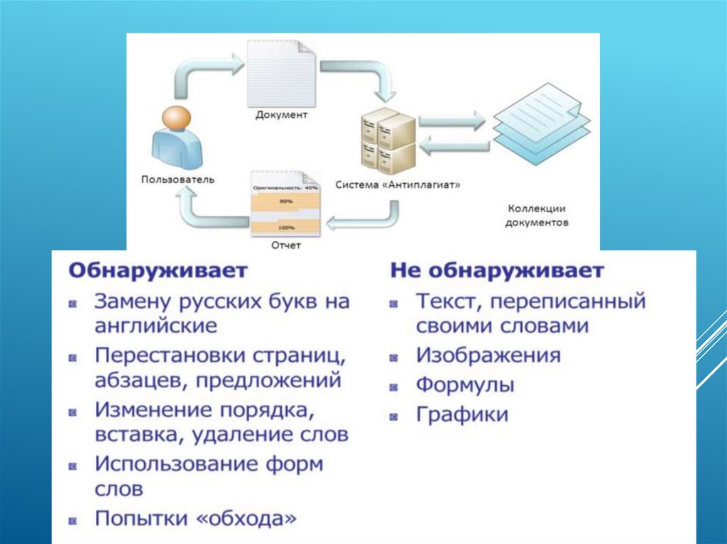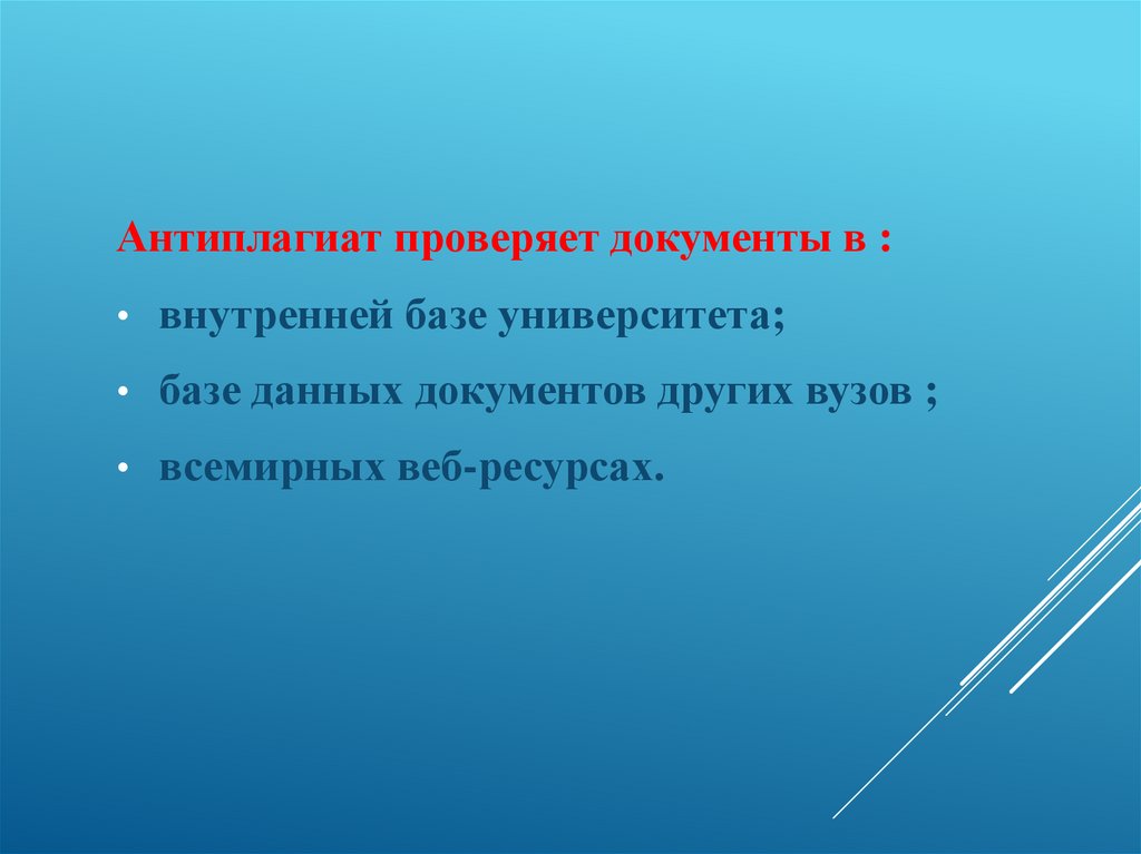 Антиплагиат проверяет документы в :внутренней базе университета;