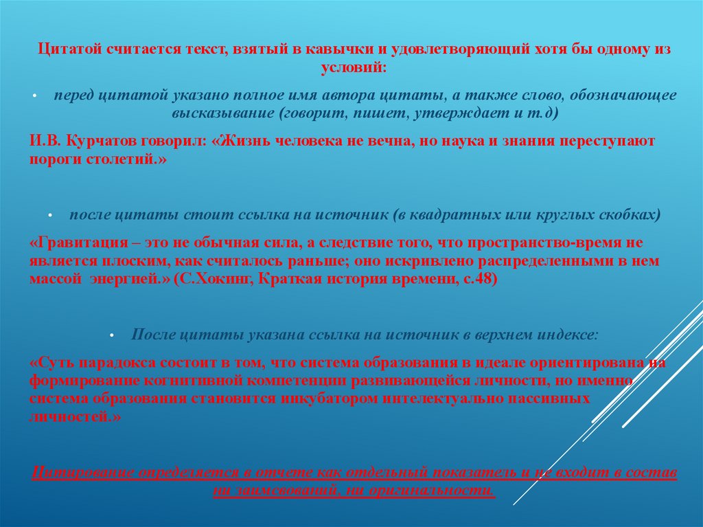 Цитатой считается текст, взятый в кавычки и удовлетворяющий хотя бы одному изусловий: