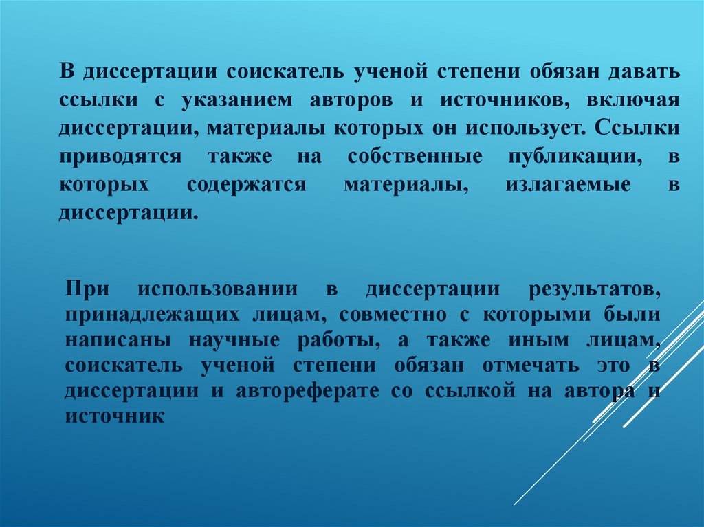 В диссертации соискатель ученой степени обязан даватьссылки с указанием авторов и источников, включая