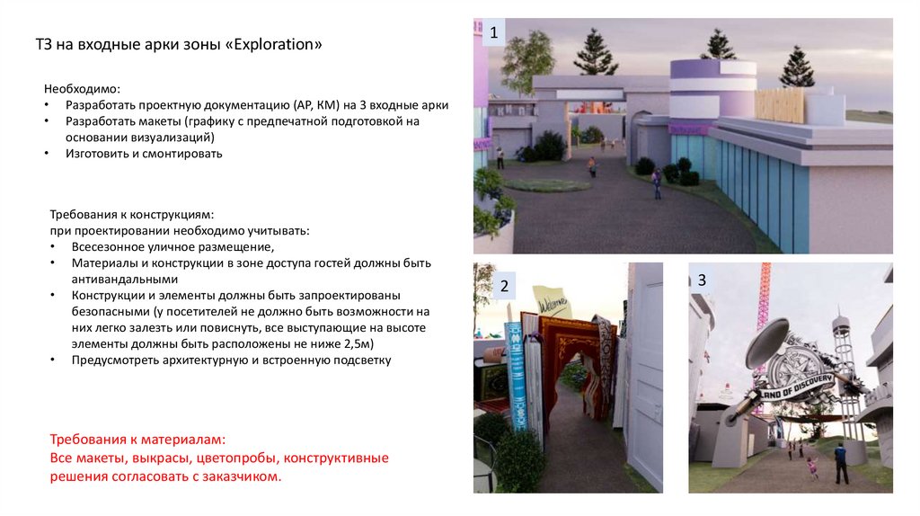 • Разработать проектную документацию (АР, КМ) на 3 входные арки