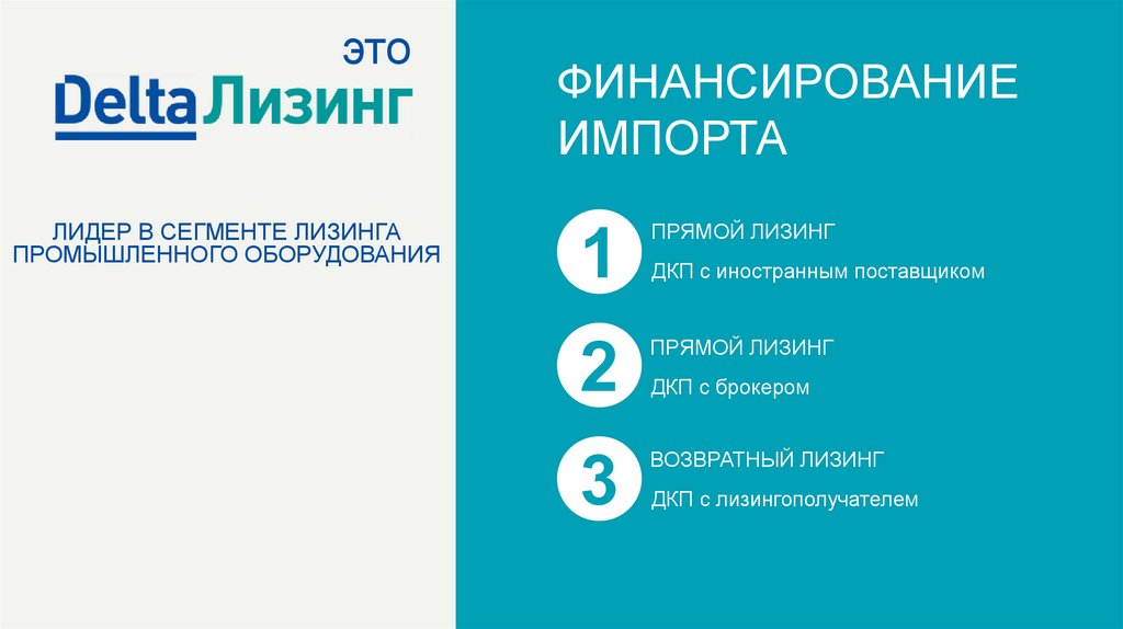 DeltaЛизинг - Федеральная лизинговая компания «ДельтаЛизинг» (входит в ИГ «Инсайт») 25 лет предлагаетфинансовые решения для лизинга промышленного оборудования, спецтехники, грузового транспорта.