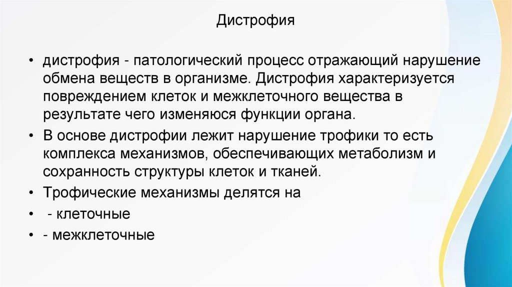 Дистрофия• дистрофия - патологический процесс отражающий нарушение