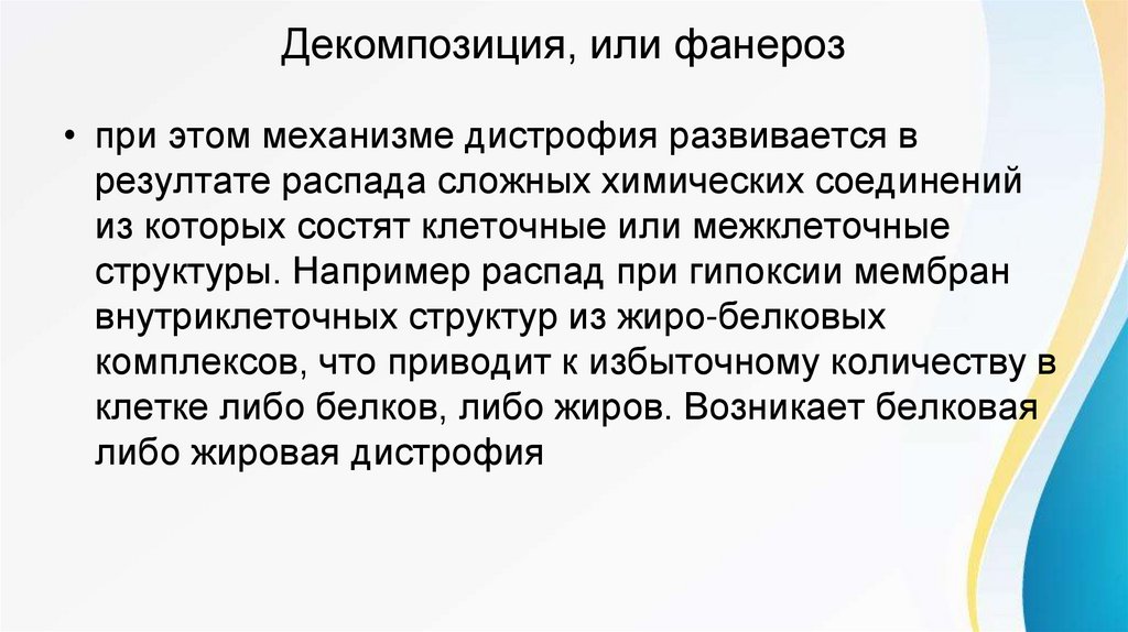 Декомпозиция, или фанероз• при этом механизме дистрофия развивается в