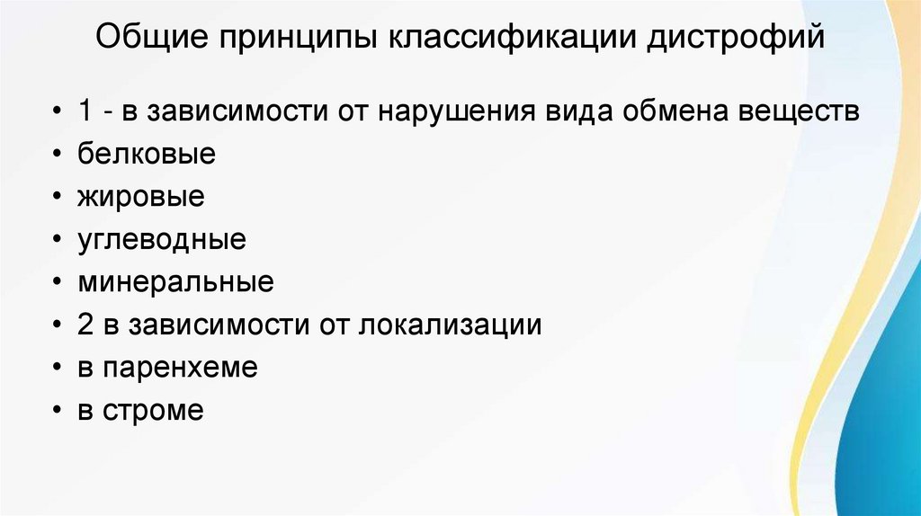Общие принципы классификации дистрофий• 1 - в зависимости от нарушения вида обмена веществ