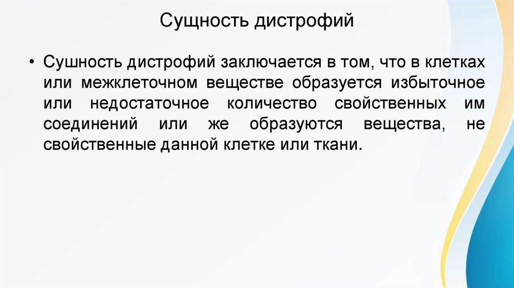 Сущность дистрофий• Сушность дистрофий заключается в том, что в клетках