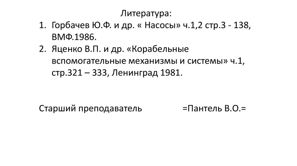 Литература:1. Горбачев Ю.Ф. и др. « Насосы» ч.1,2 стр.3 - 138,