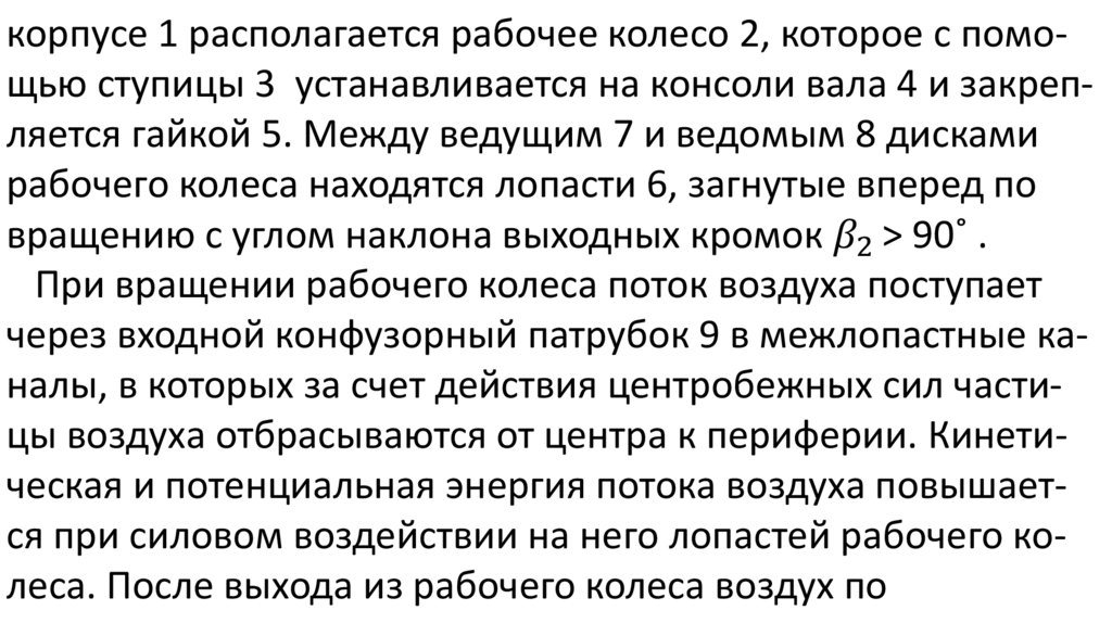 корпусе 1 располагается рабочее колесо 2, которое с помощью ступицы 3 устанавливается на консоли вала 4 и закрепляется гайкой 5. Между ведущим 7 и ведомым 8 дискамирабочего колеса находятся лопасти 6, загнутые вперед по