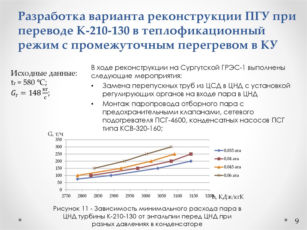 Рисунок 1 - Зависимость минимального расхода пара в ЦНД турбины К-210130 от энтальпии перед ЦНД при разных давлениях в конденсаторе
