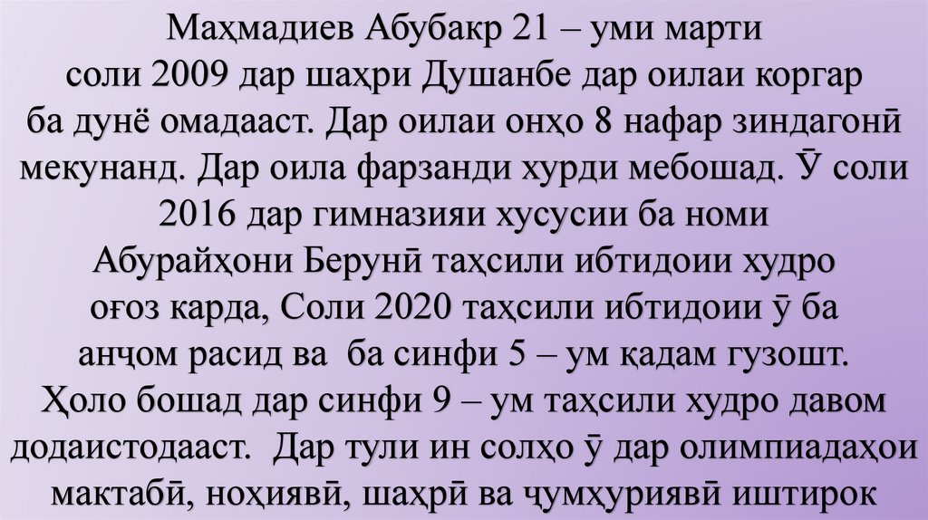 Маҳмадиев Абубакр 21 – уми мартисоли 2009 дар шаҳри Душанбе дар оилаи коргар