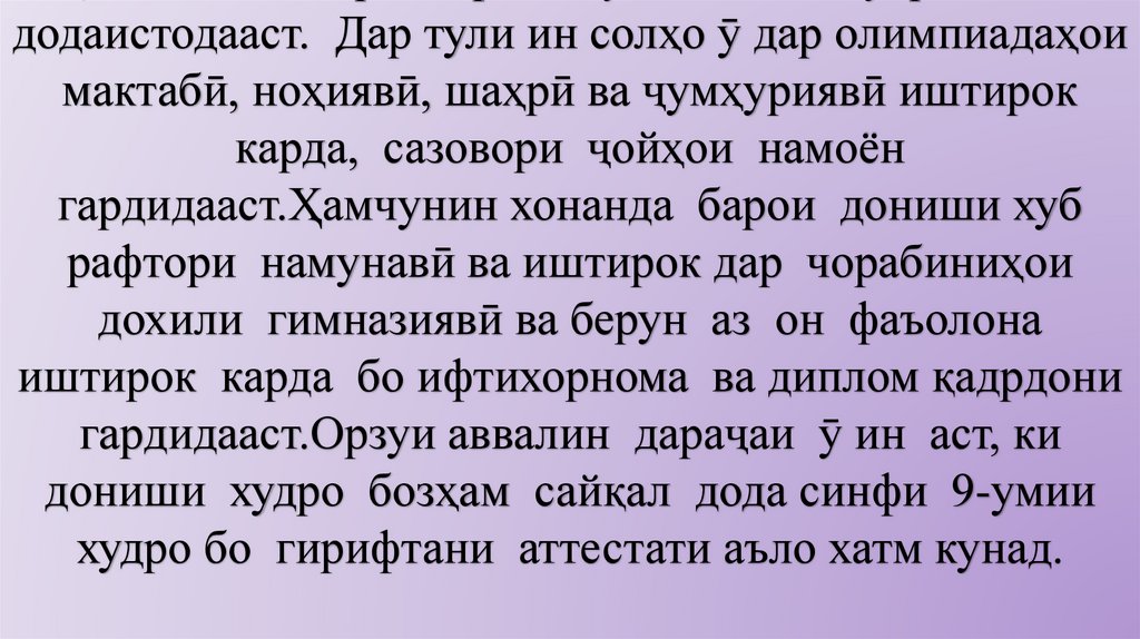 додаистодааст. Дар тули ин солҳо ӯ дар олимпиадаҳоимактабӣ, ноҳиявӣ, шаҳрӣ ва ҷумҳуриявӣ иштирок
