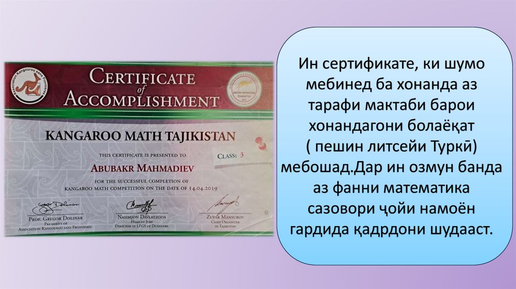 Ин сертификате, ки шумомебинед ба хонанда аз