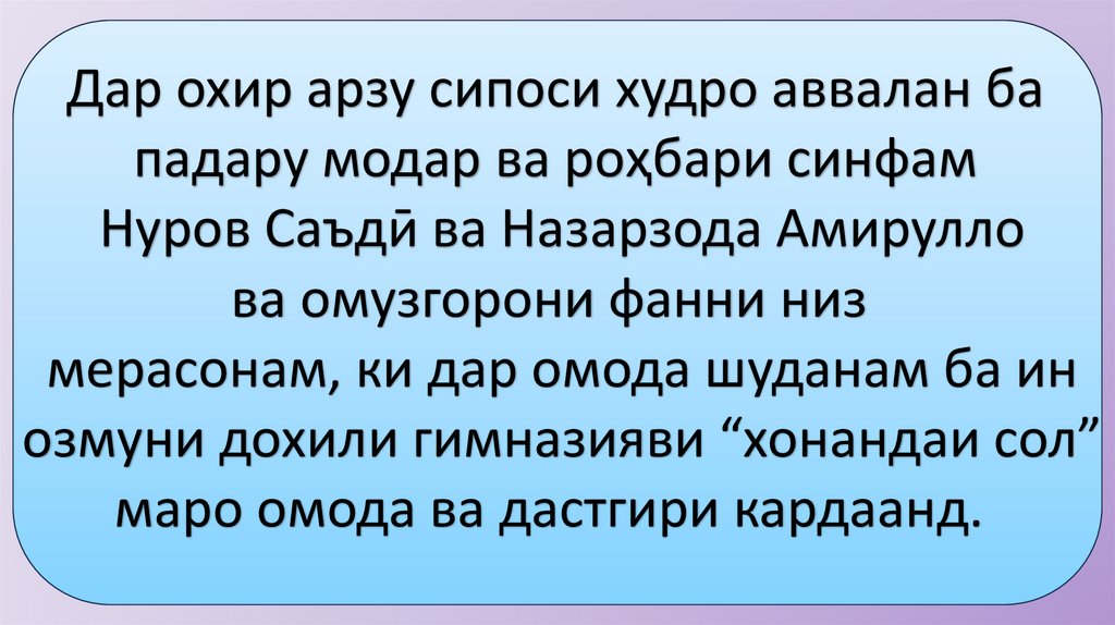 Дар охир арзу сипоси худро аввалан бападару модар ва роҳбари синфам