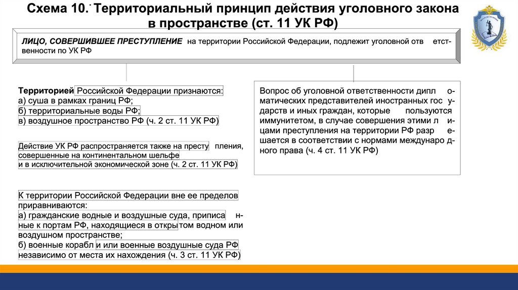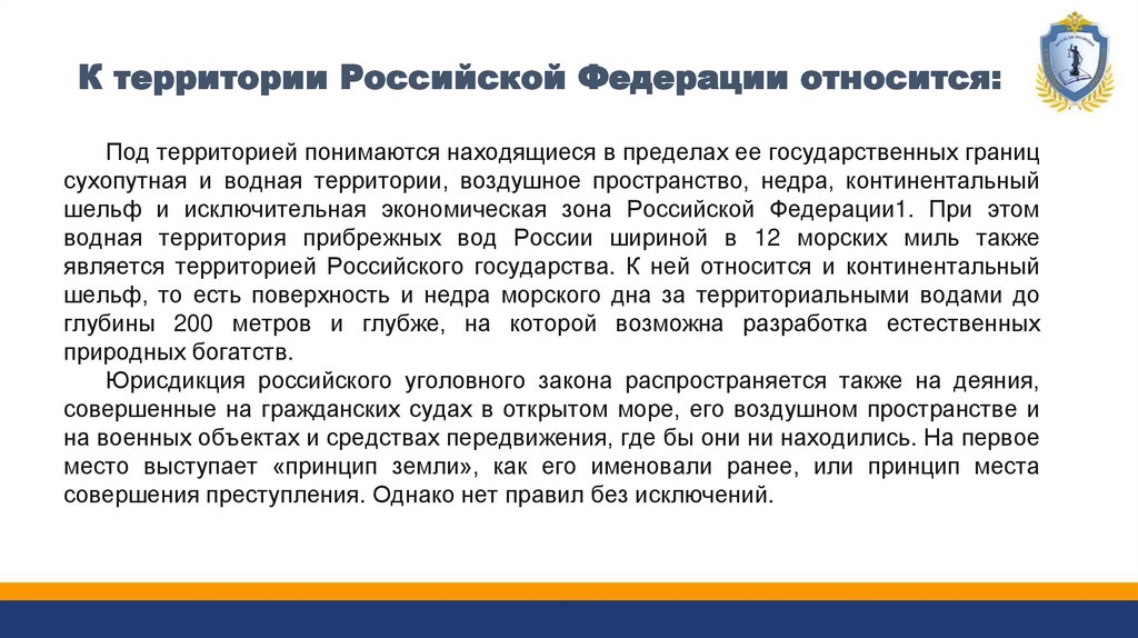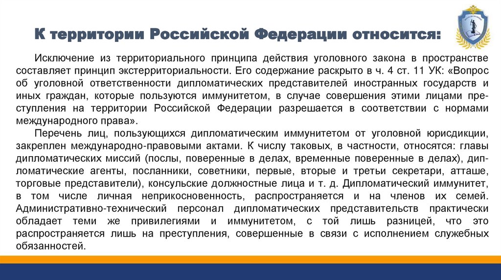 К территории Российской Федерации относится:Исключение из территориального принципа действия уголовного закона в пространстве
