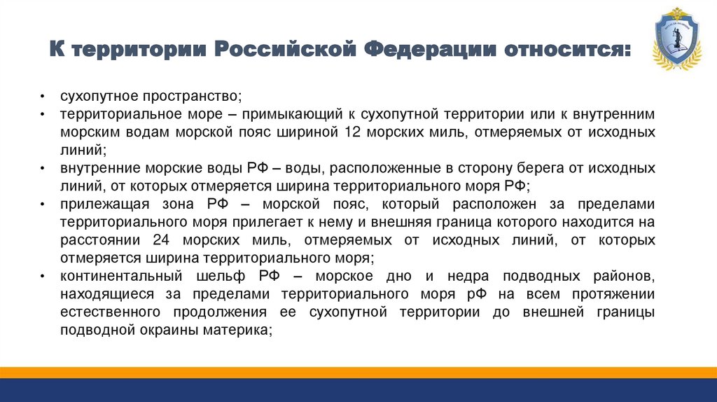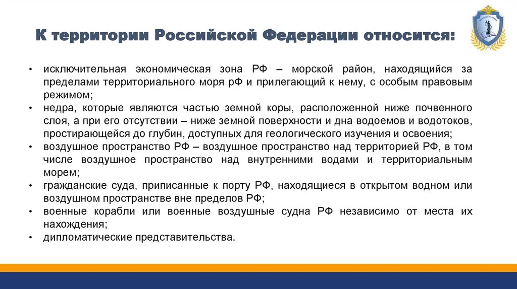К территории Российской Федерации относится:Под территорией понимаются находящиеся в пределах ее государственных границ