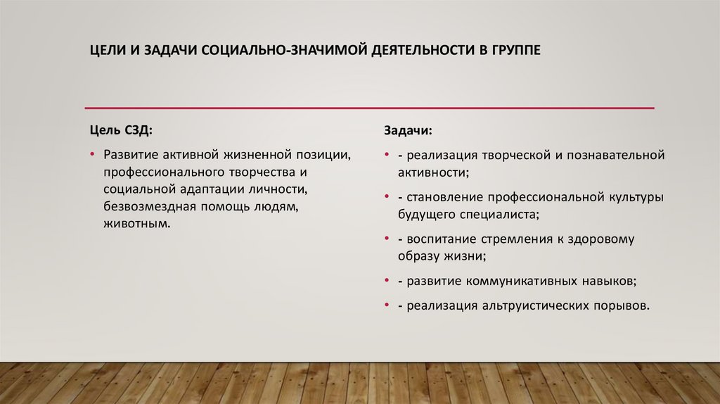 ЦЕЛИ И ЗАДАЧИ СОЦИАЛЬНО-ЗНАЧИМОЙ ДЕЯТЕЛЬНОСТИ В ГРУППЕЦель СЗД:
