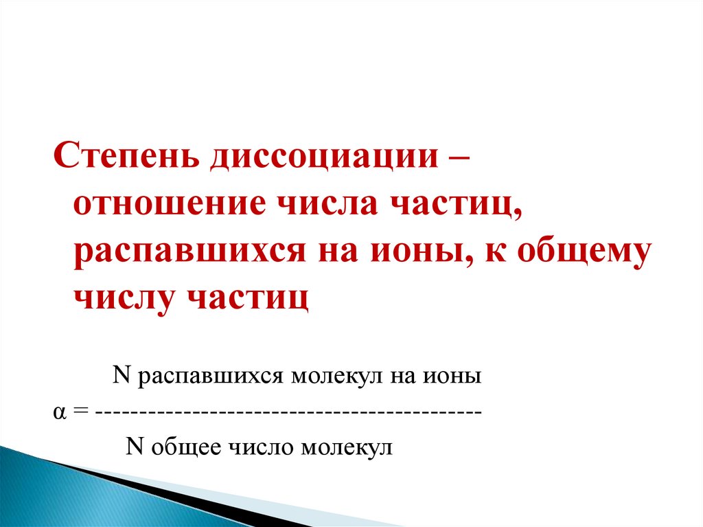Степень диссоциации –отношение числа частиц,