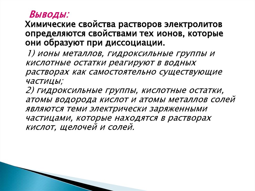 Выводы:Химические свойства растворов электролитов