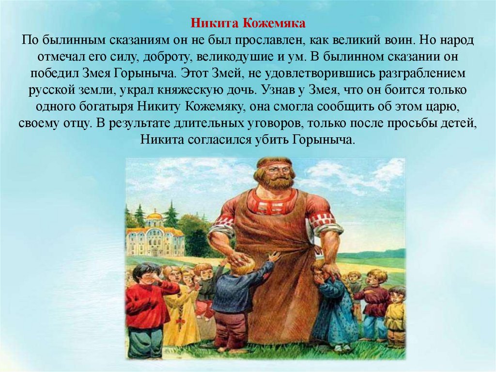 Никита КожемякаПо былинным сказаниям он не был прославлен, как великий воин. Но народ