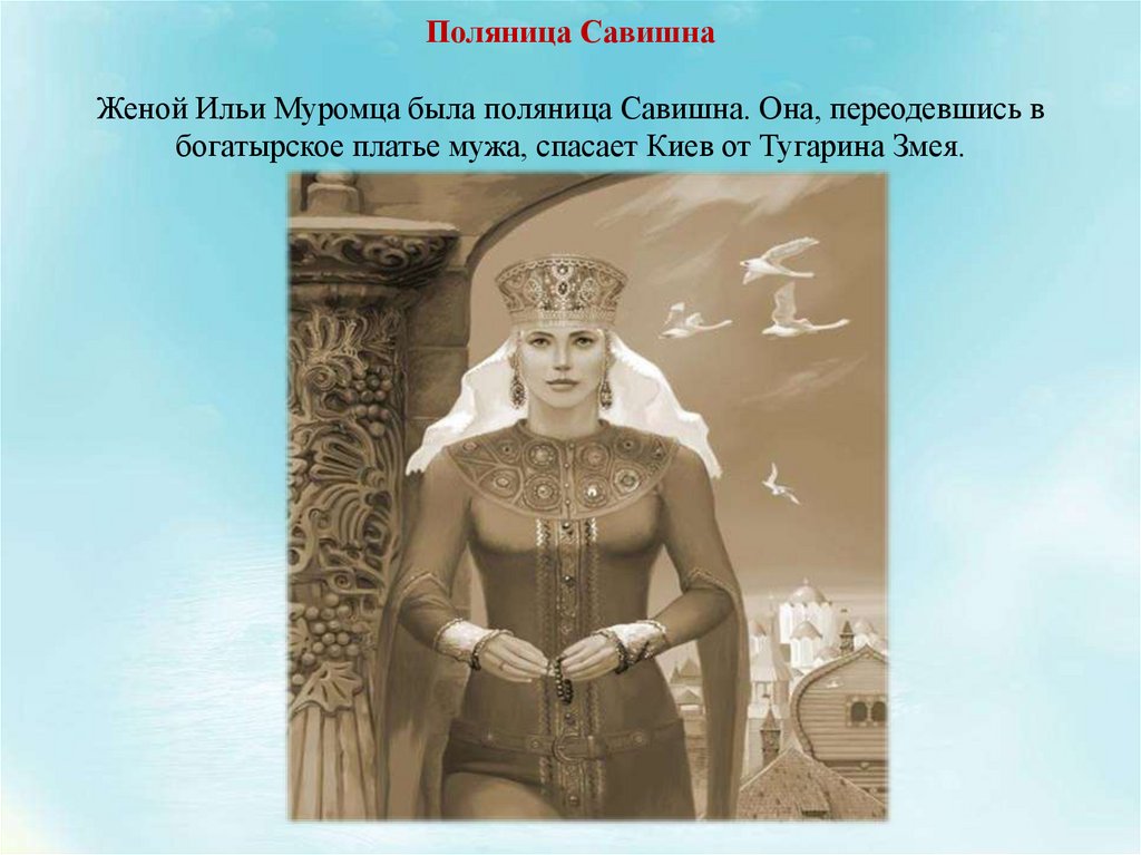 Поляница СавишнаЖеной Ильи Муромца была поляница Савишна. Она, переодевшись в