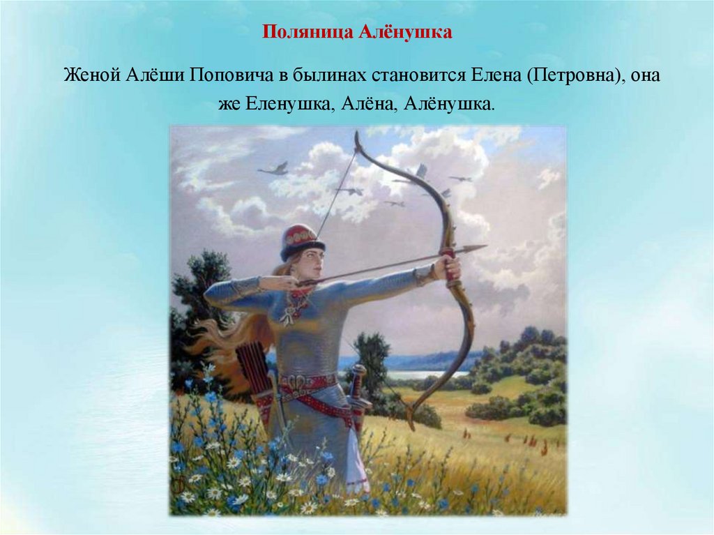 Поляница АлёнушкаЖеной Алёши Поповича в былинах становится Елена (Петровна), она