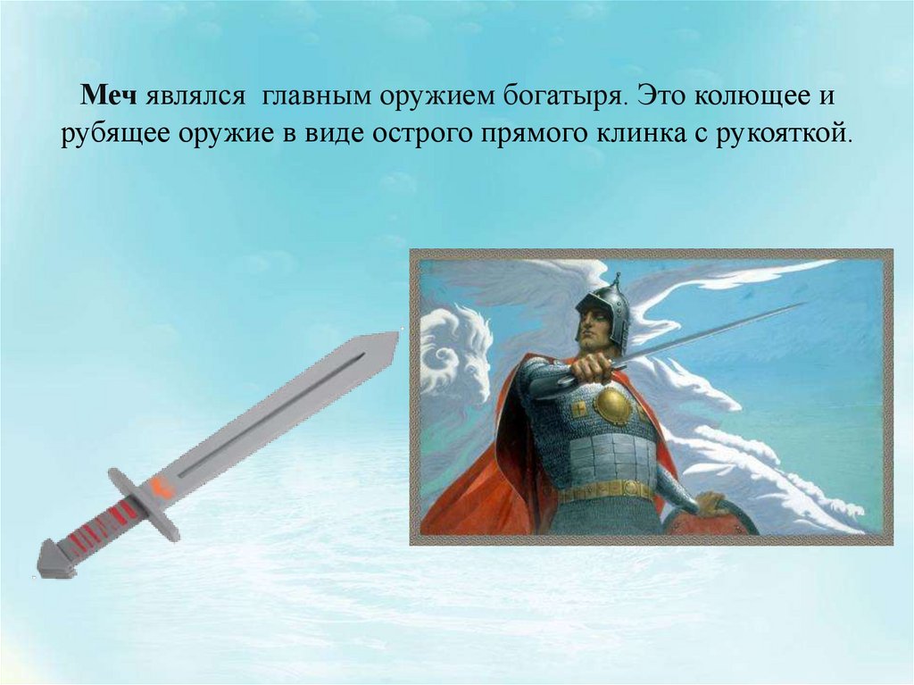 Меч являлся главным оружием богатыря. Это колющее ирубящее оружие в виде острого прямого клинка с рукояткой.