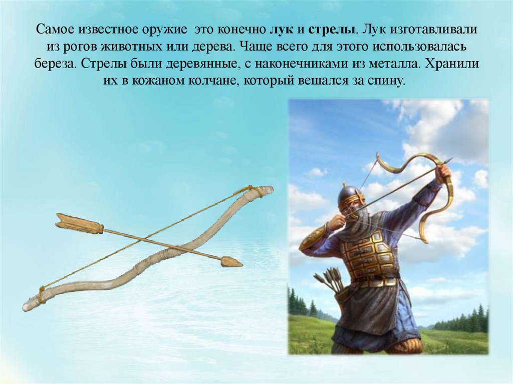 Самое известное оружие это конечно лук и стрелы. Лук изготавливалииз рогов животных или дерева. Чаще всего для этого использовалась