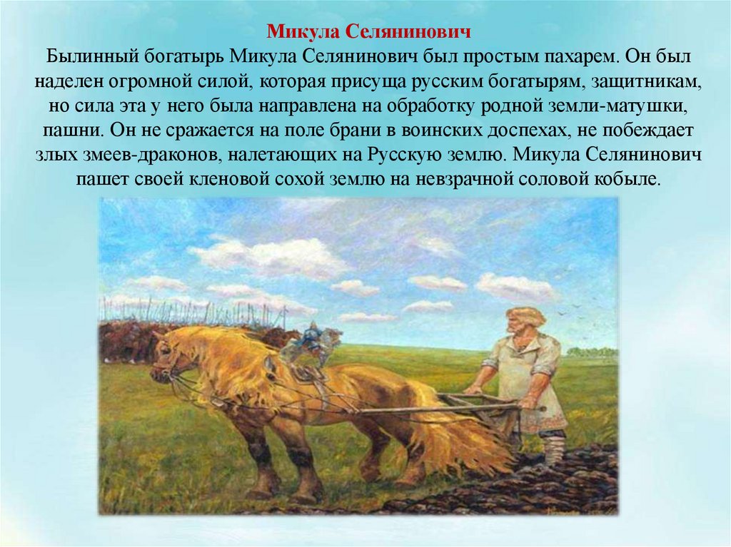 Микула СеляниновичБылинный богатырь Микула Селянинович был простым пахарем. Он был