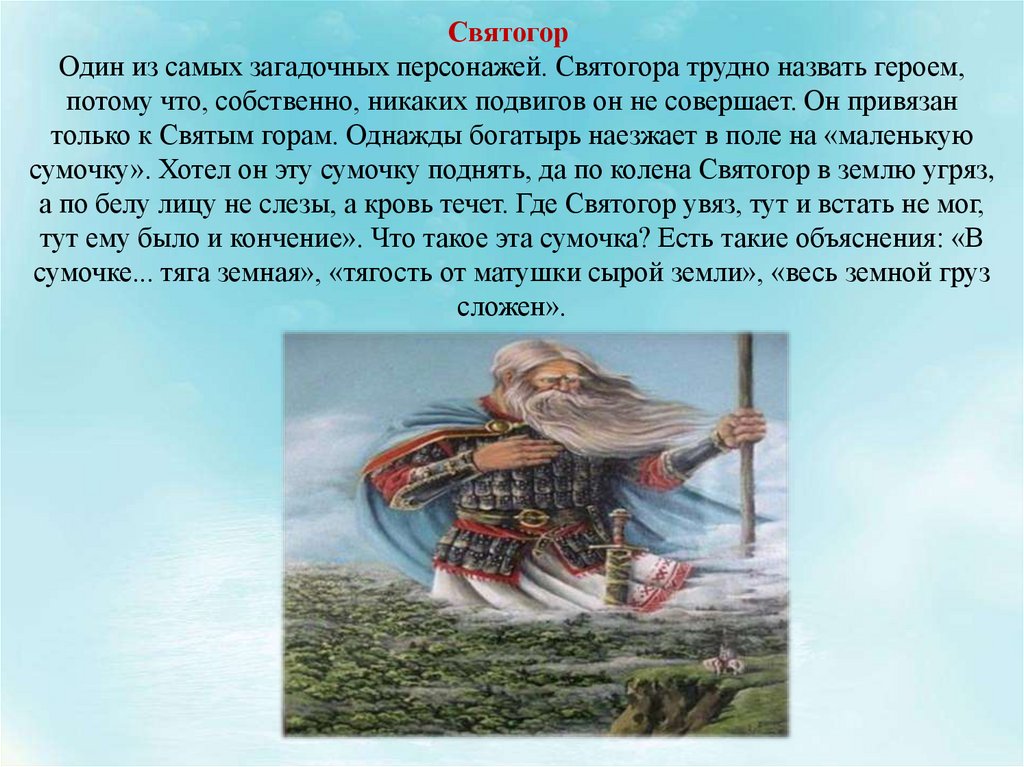 СвятогорОдин из самых загадочных персонажей. Святогора трудно назвать героем,