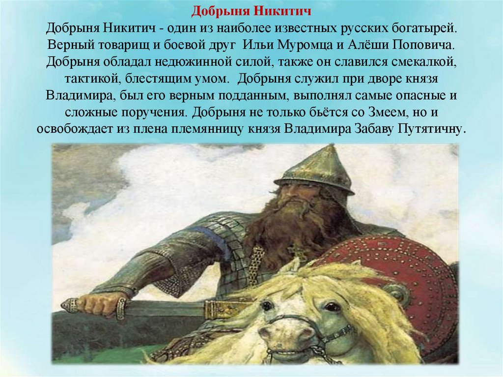Добрыня НикитичДобрыня Никитич - один из наиболее известных русских богатырей.