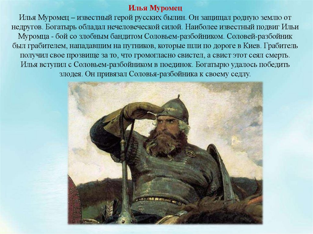 Илья МуромецИлья Муромец – известный герой русских былин. Он защищал родную землю от