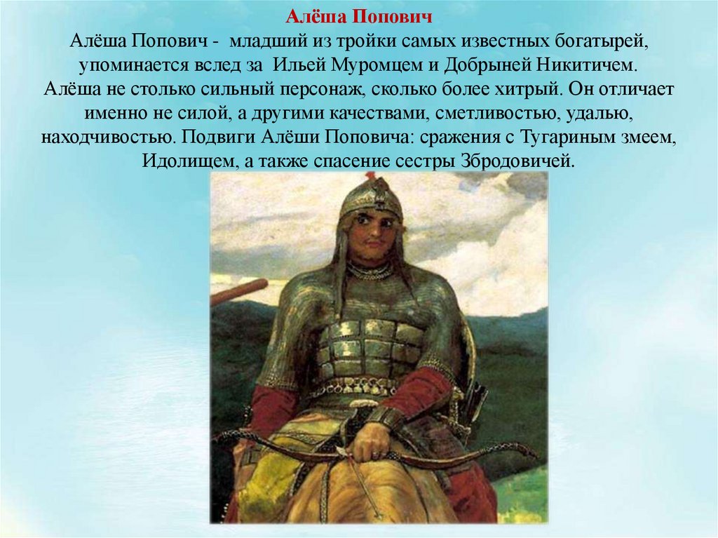 Алёша ПоповичАлёша Попович - младший из тройки самых известных богатырей,