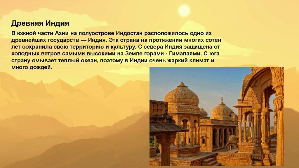 Древняя ИндияВ южной части Азии на полуострове Индостан расположилось одно из
