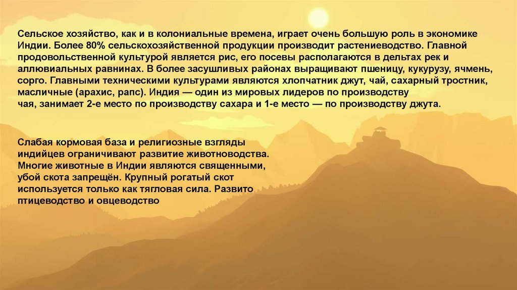 Сельское хозяйство, как и в колониальные времена, играет очень большую роль в экономикеИндии. Более 80% сельскохозяйственной продукции производит растениеводство. Главной