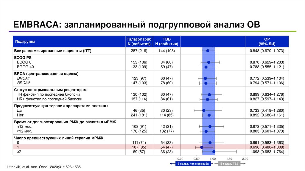 Талазопариб в рамках РКИ EMBRACA статистически значимоувеличивал ВБП в следующих подгруппах
