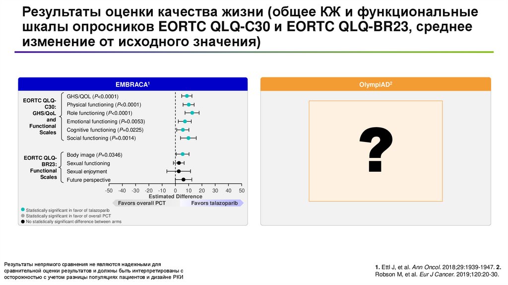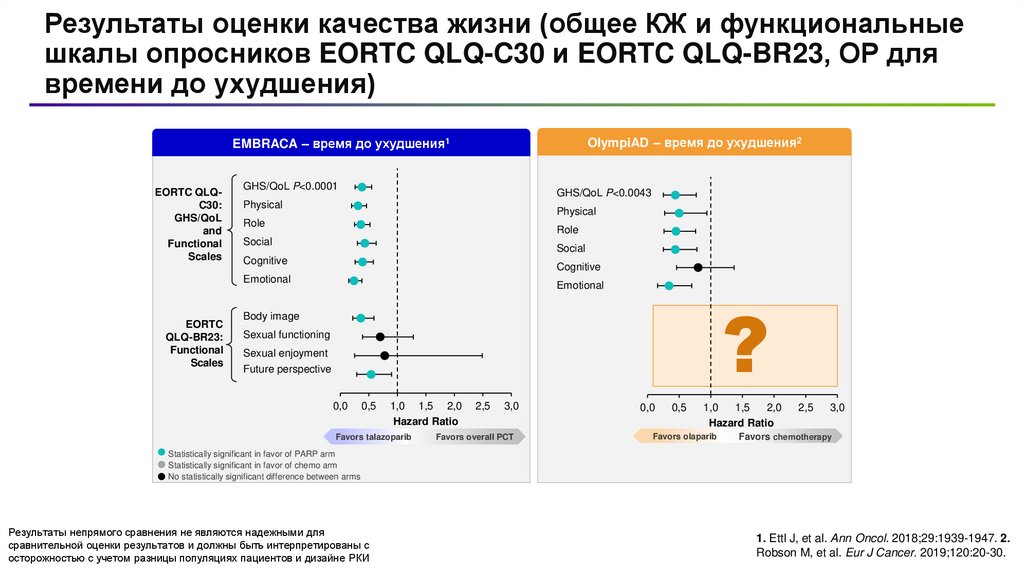 Результаты оценки качества жизни (общее КЖ и функциональныешкалы опросников EORTC QLQ-C30 и EORTC QLQ-BR23, ОР для