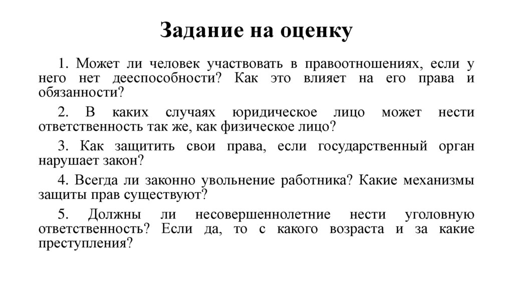 Правоотношения и субъекты права. Задание на оценку