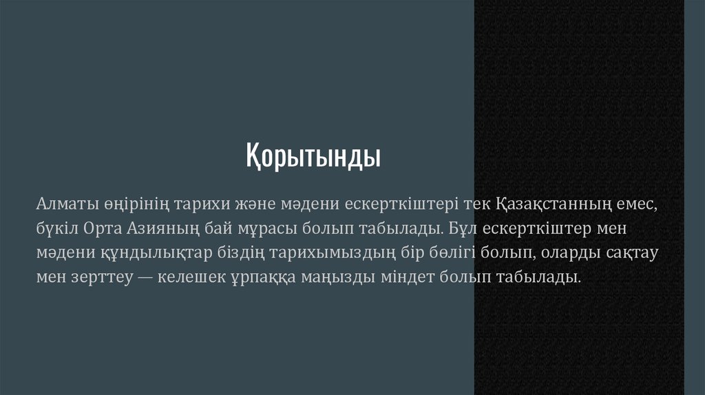ҚорытындыАлматы өңірінің тарихи және мәдени ескерткіштері тек Қазақстанның емес,
