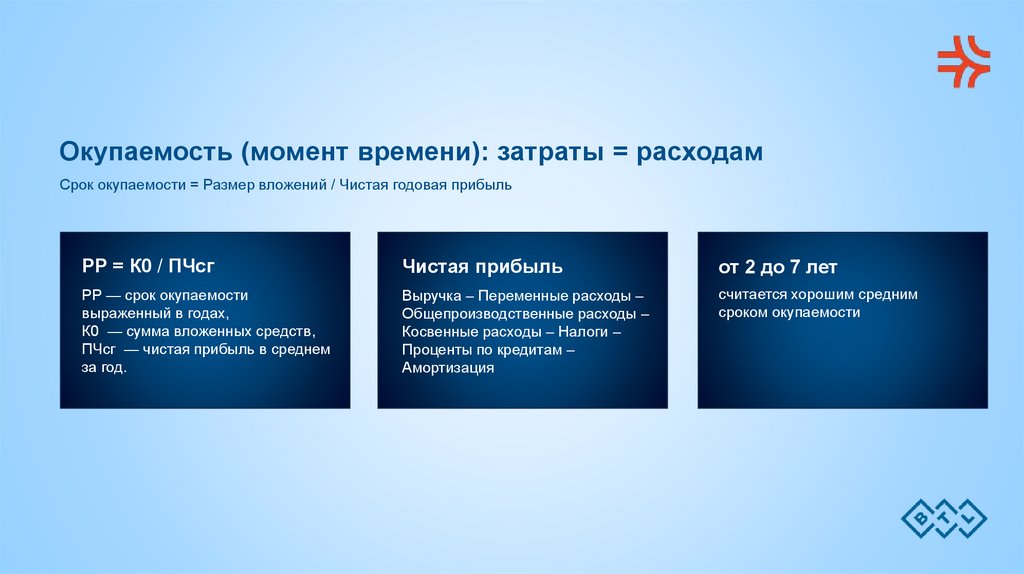 Окупаемость (момент времени): затраты = расходамСрок окупаемости = Размер вложений / Чистая годовая прибыль