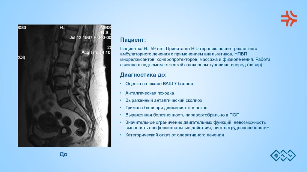 Пациент:Пациентка Н., 59 лет. Принята на HIL-терапию после трехлетнего