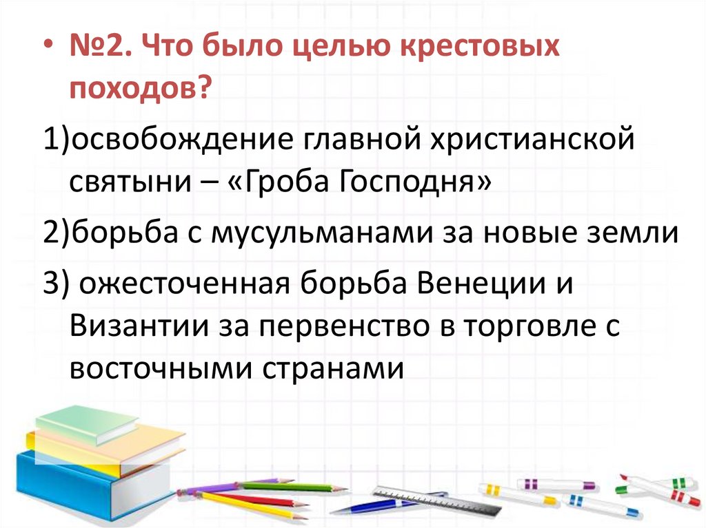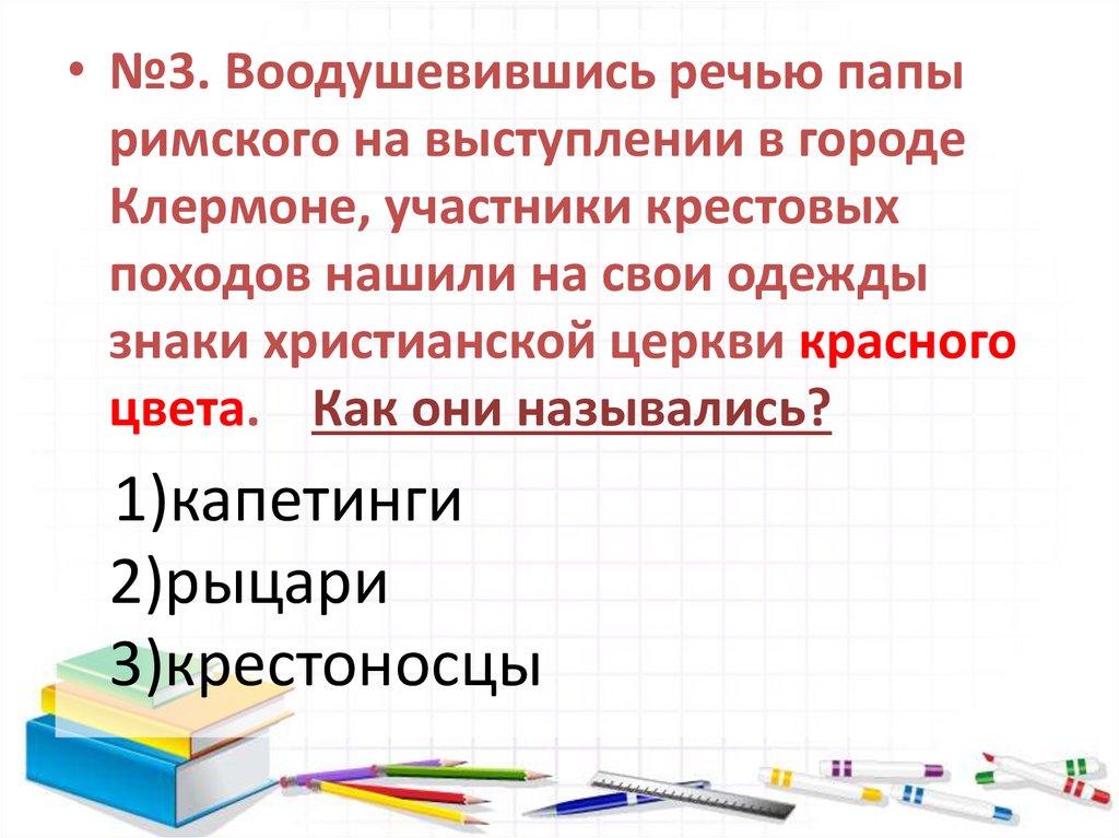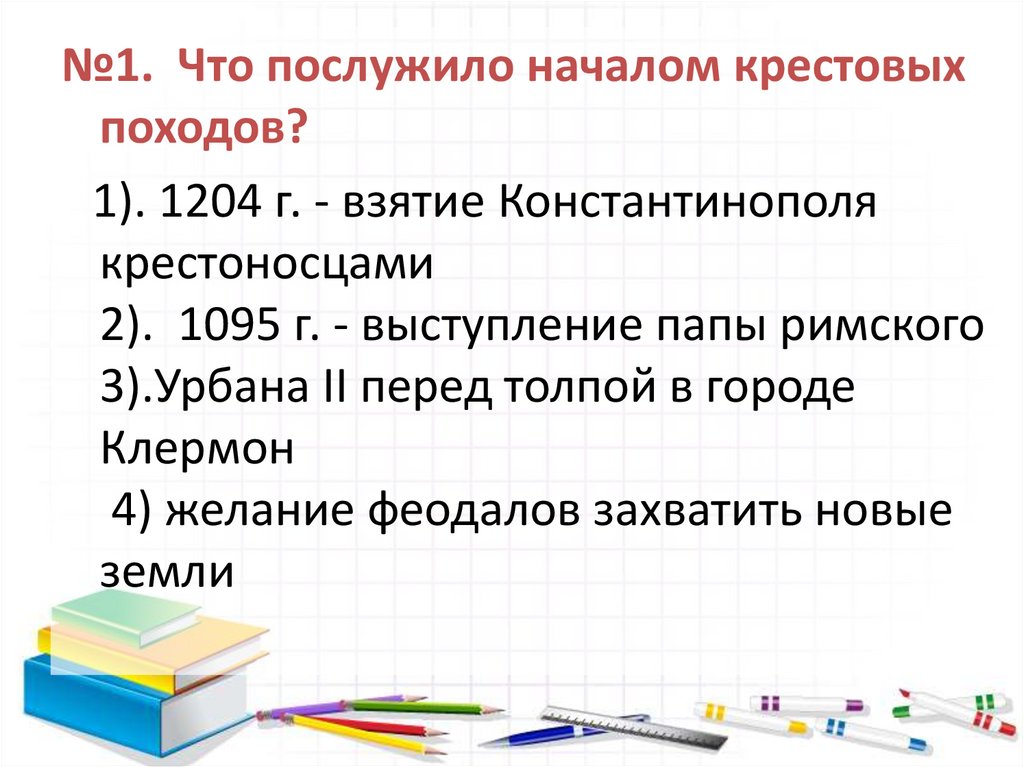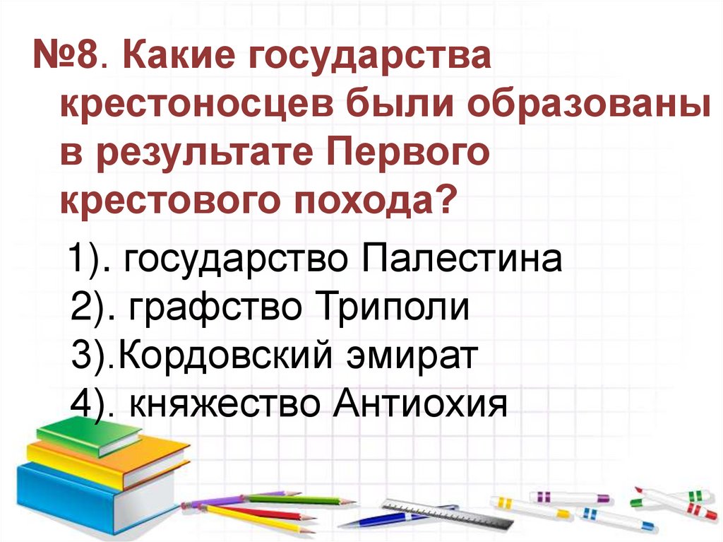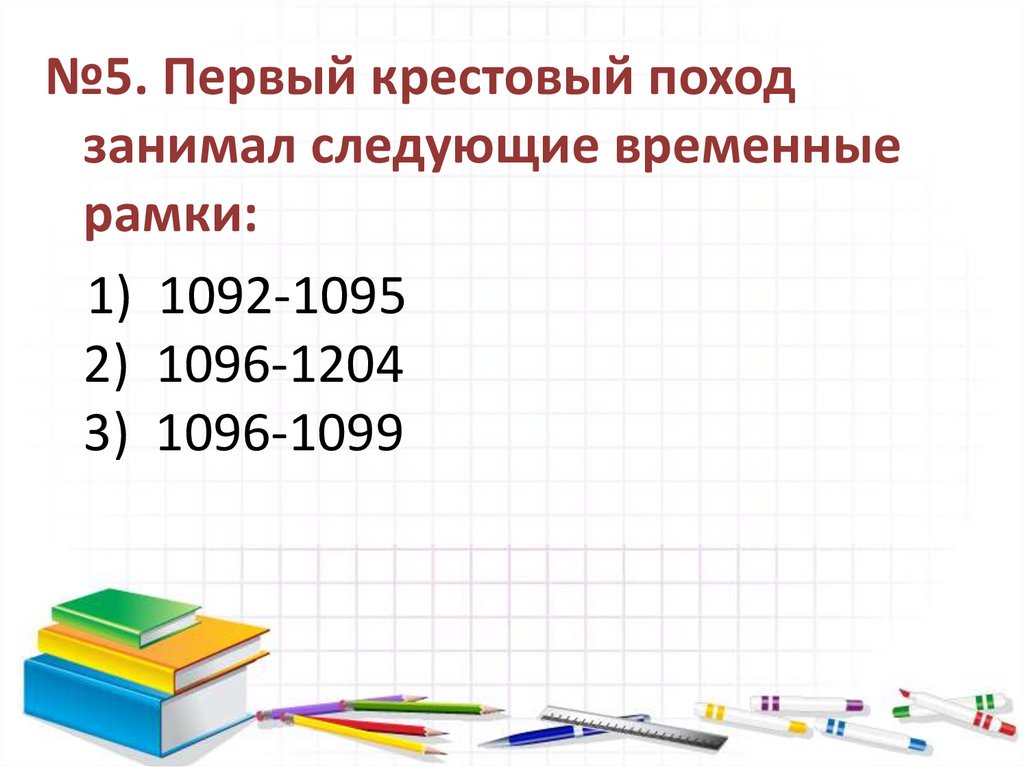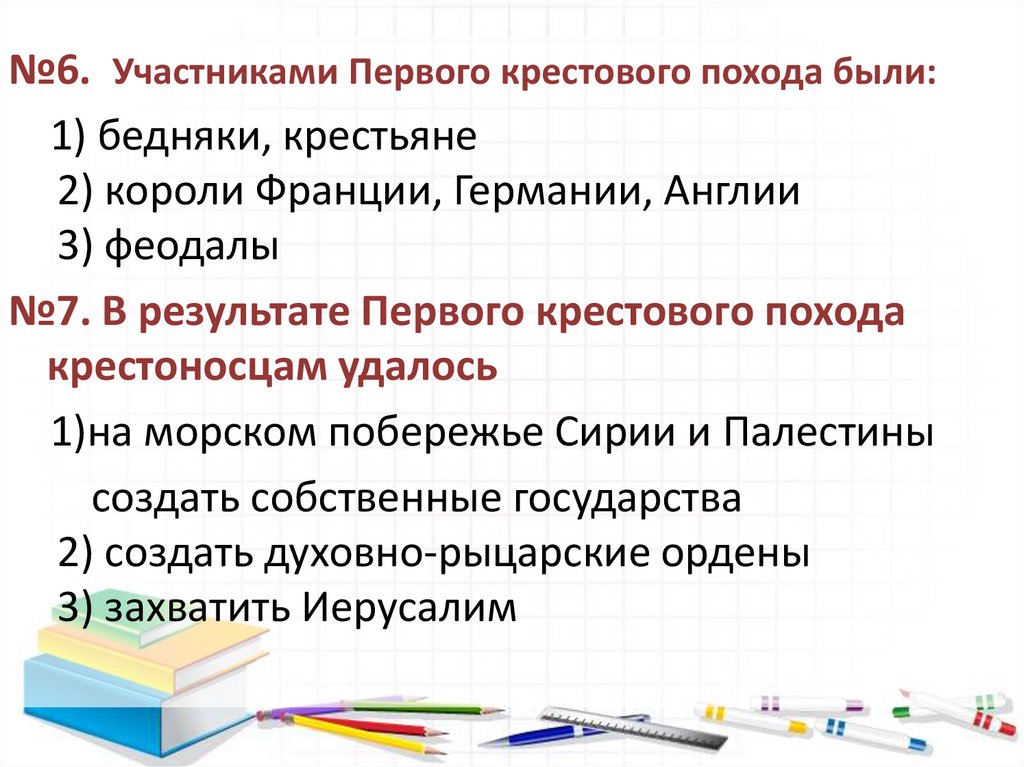 №6. Участниками Первого крестового похода были:1) бедняки, крестьяне
