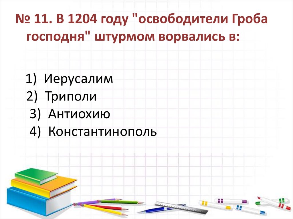 № 11. В 1204 году "освободители Гробагосподня" штурмом ворвались в: