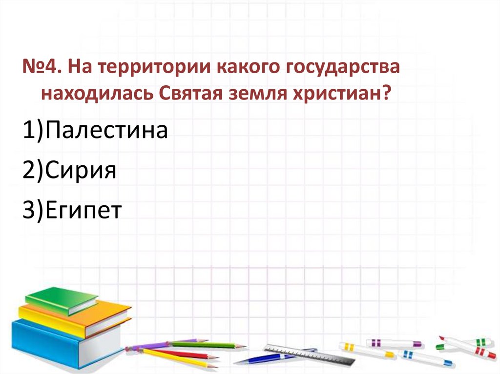 №4. На территории какого государстванаходилась Святая земля христиан?