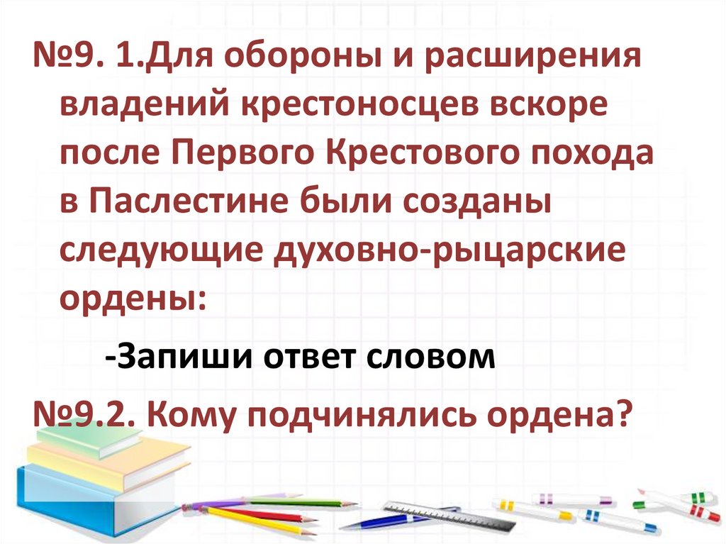 №9. 1.Для обороны и расширениявладений крестоносцев вскоре